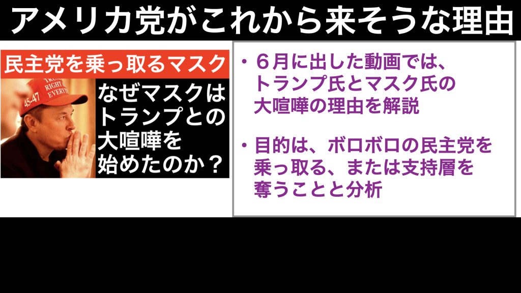 この動画を作ったのは、ちょうど1ヶ月ぐらい前ですが、それからマスク氏はアメリカ党を立ち上げると宣言しており、このシナリオが進んでいるように、個人的には感じています。