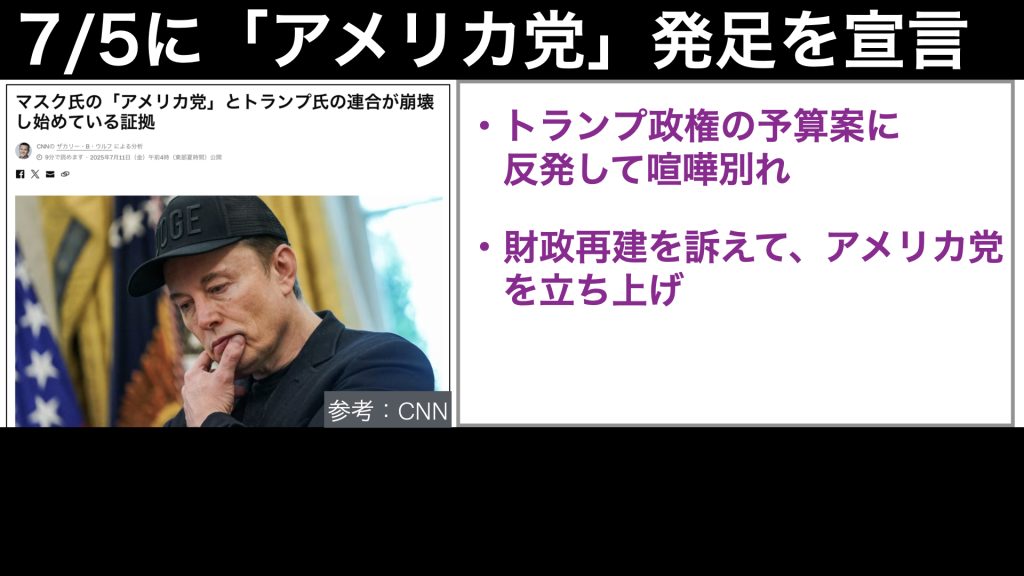 7月5日に、イーロン・マスク氏は「アメリカ党」を新たに立ち上げると表明しました。