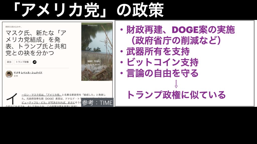 今回のトランプ政権のワンビッグビューティフルビルには、DOGEが提案した削減内容をほとんど盛り込まなかったということは、マスク氏のアメリカ党でなければ、このような政策ができないという、国民の認識にもつながります。