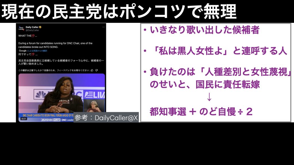 トランプ氏が出した政策を真似てくるような、ポリシーのなさで、2月に行われた民主党全国委員会の委員長選挙においても、政策についての議論はほとんど行われず、いきなり歌を歌い出す立候補者まで現れるような始末です。