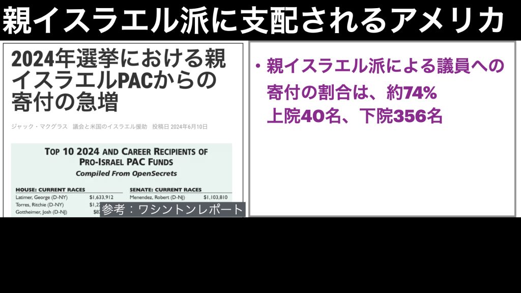 その中でも、イスラエル支持を明確に打ち出している議員は、42%いると言われており、イスラエルが何をやろうが、絶対にアメリカは否定できない状態となっています。