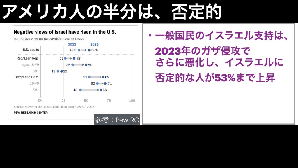 ピューリサーチセンターによると、イスラエルに対して否定的な見方をしているアメリカ人の割合は、53%もおり、2022年調査に比べて、11%も増加していました。