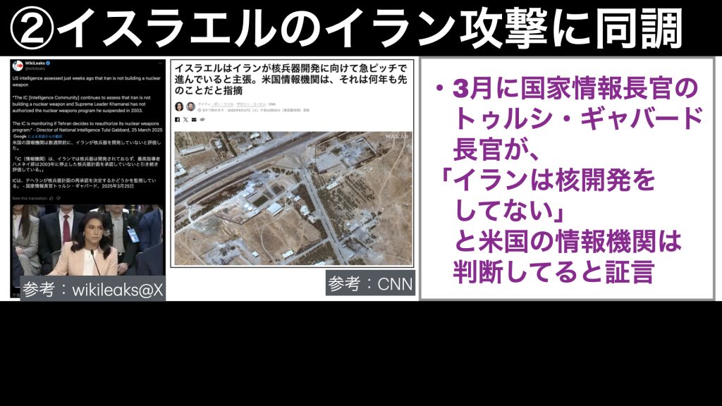 しかし、イランの核開発疑惑については、国家情報長官のトゥルシー・ギャバード氏が、イランは核開発をしていないと、3月に議会で証言をしており、CIAなどの情報機関でも、そのような認識にあるということが、ニュースで報道されています。