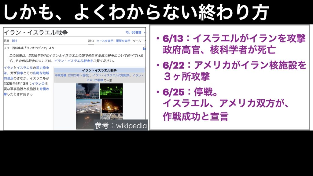 なので、本当に核施設が破壊されたのか?よくわからないにも関わらず、アメリカもイスラエルも、作戦は成功した!と喜んで、イランと停戦してしまったのです。