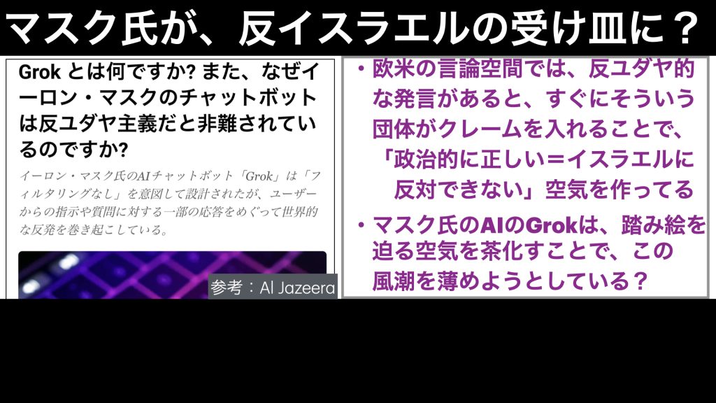 その後、2023年にイスラエルのネタニヤフ首相と会って、イスラエル支持を明確にした、という過去があるため、新イスラエルのように見えますが、最近、マスク氏が作ったAIGROKを使うと、反ユダヤ的な回答が返ってくるということで、物議を醸しています。