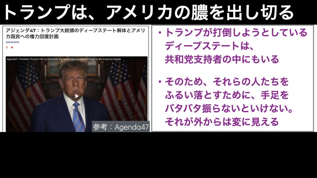 そして、それらは体に張り付いてくる虫のように、共和党内にも、トランプ支持層にもいっぱい含まれているはずです。それを振り解くためには、手足を振り回したりして、体についている虫を振り落とさなければいけません。