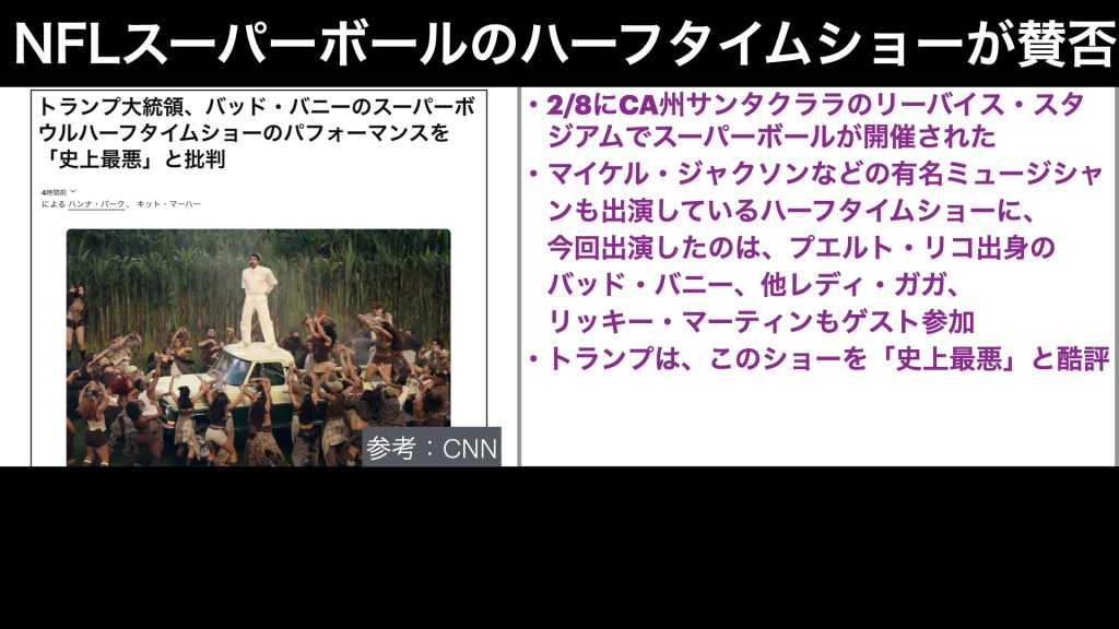 それで、今回のハーフタイムショーに選ばれたのは、バッドバニーというプエルトリコ出身のミュージシャンで、他にもレディ・ガガや、リッキー・マーティンがゲスト参加していたのですが、トランプ氏はこのショーを「史上最悪」と酷評し、なかなかな話題となっていました。
