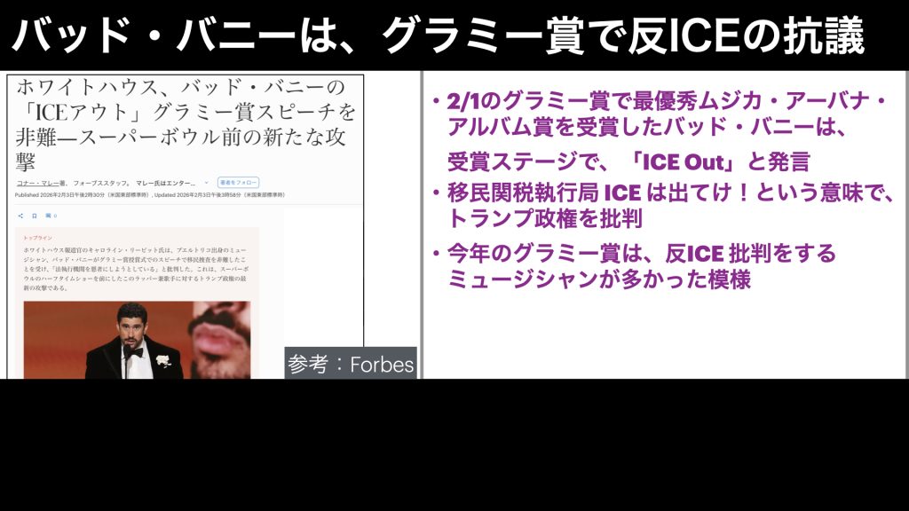 今年のグラミー賞は、ビリー・アイリッシュなど、反ICE を掲げるミュージシャンが多かったようですが、バッドバニーもその中に入っていたんですね。