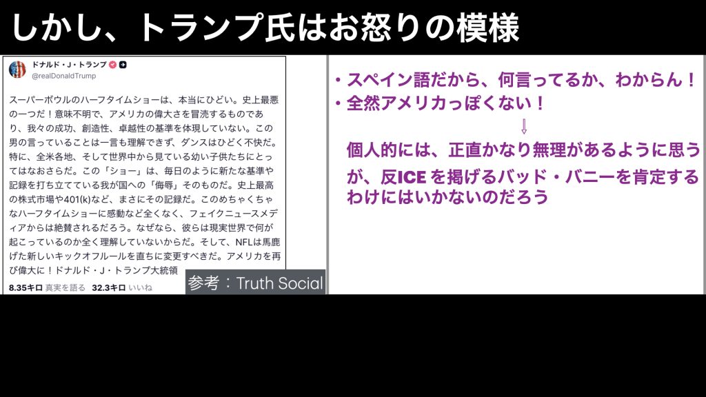 そのため、トランプ氏としても、反ICE を掲げるバッドバニーを酷評せざるを得ないという状況なのでしょう。