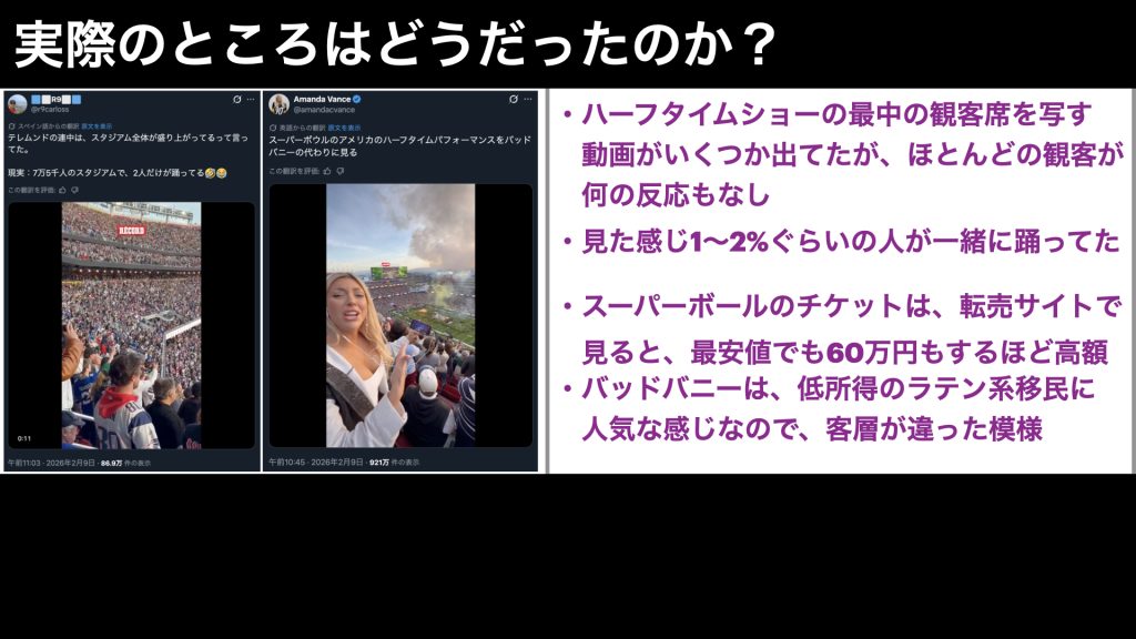 SNSでその模様を投稿している人が何人かいたので見てみたのですが、みた感じ、ハーフタイムショーで盛り上がっていたのは、全体の1~2%もいない感じでした。