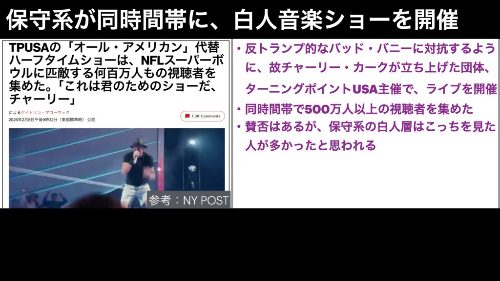 ただ、白人の保守派から見ると、確かに今回のバッドバニーは、スペイン語で訳のわからんことを歌われていて、全く自分たちのスタイルと違う音楽なので、乗れないし、反ICE を宣言しているミュージシャンなので、反発は大きかったでしょう。