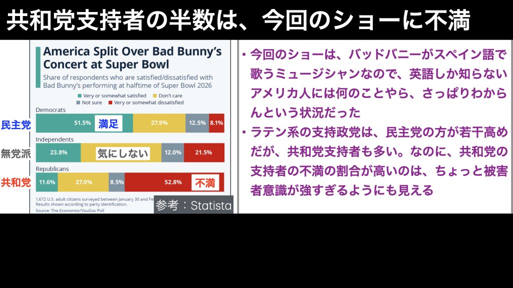 これを見ると、民主党支持者の半数以上が、バッドバニーに満足と答え、共和党の半数以上が不満と答えていました。ただ、赤色の不満の割合は、共和党側では多いものの、無党派や民主党側ではそれほど多くなく、トランプ支持者の白人による過剰反応という印象がありますね。