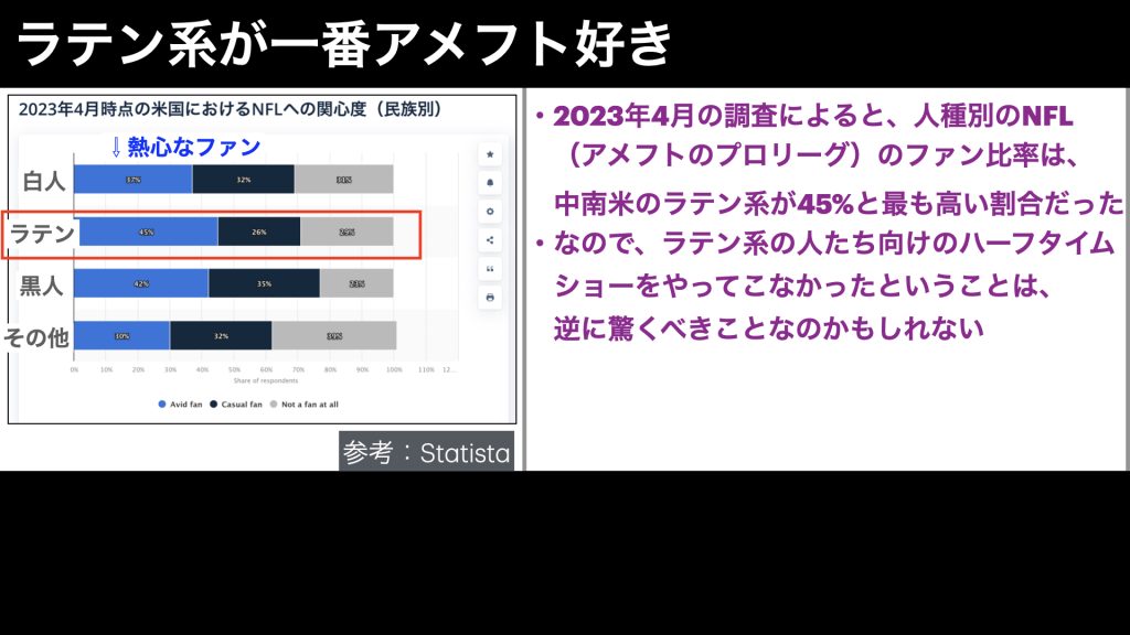 というのも、人種別にアメフトのファン比率を見てみると、熱心なファンの割合は、白人が37%、ラテン系が45%、黒人が42%と、ラテン系のアメリカ人が最も高いのです。