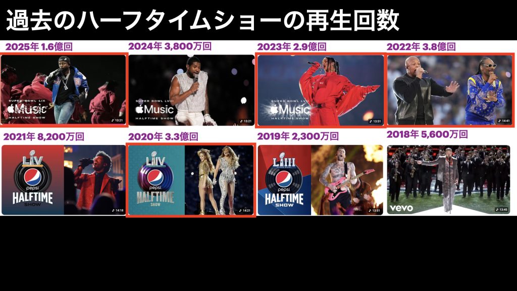 こちらは、過去のハーフタイムショーの出演アーティストと、YouTubeの動画の再生回数です。