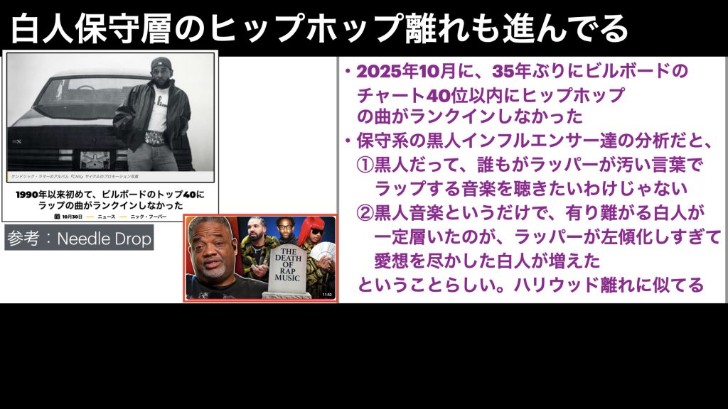 そしてもう1つが、黒人だからカッコいいとありがたがる白人が一定層いたが、ラッパーが左傾化して、トランプディスりをやりすぎて、愛想を尽かした保守層が離れていったという話です。