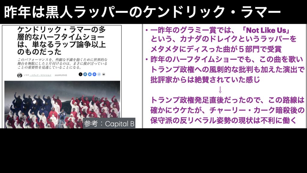 それで、昨年の出演者だった、ケンドリックラマーはかなり評価されているラッパーで、一昨年のグラミー賞では、「Not Like Us」という曲が年間最優秀レコード賞などの5部門で受賞したのですが、