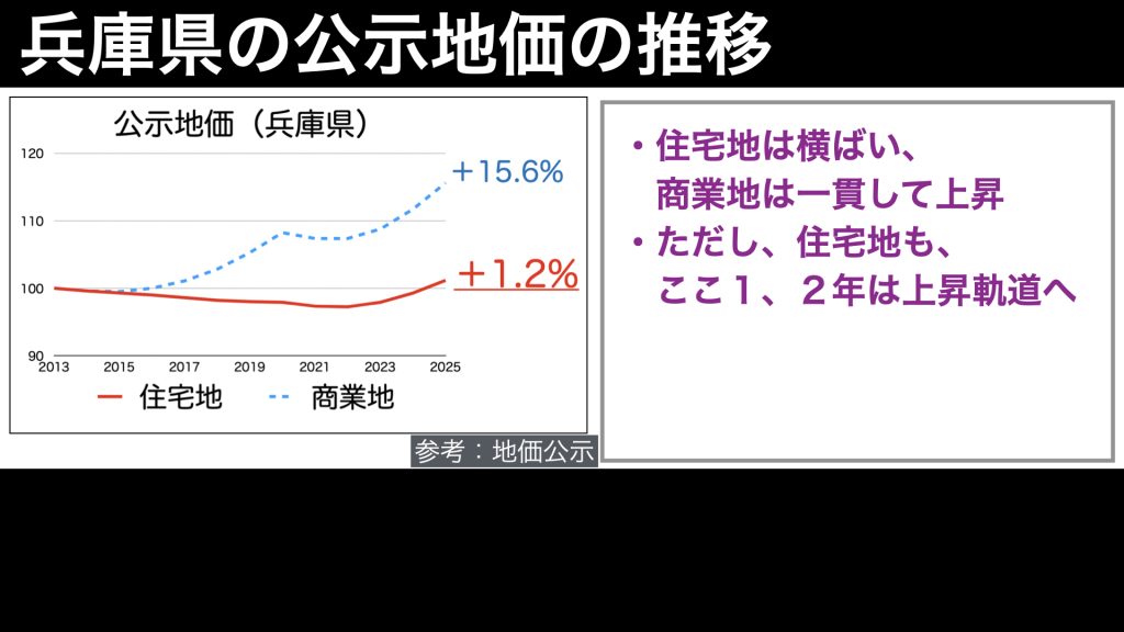 この記事では、「兵庫県の土地価格の、①この5年間の動きと、②今後の見通し」について、解説します。