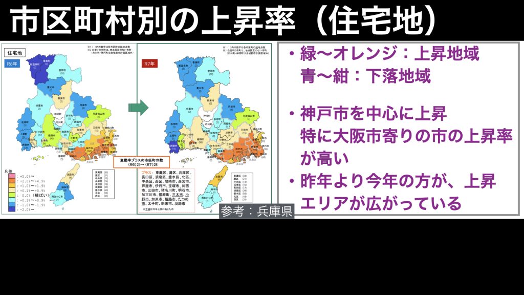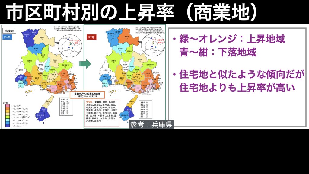 なお、上昇している市町村の数が1つ減ってますが、これはたつの市の商業地として計測する地点がなくなったためであり、上昇エリアの数は、実質的に横ばいです。