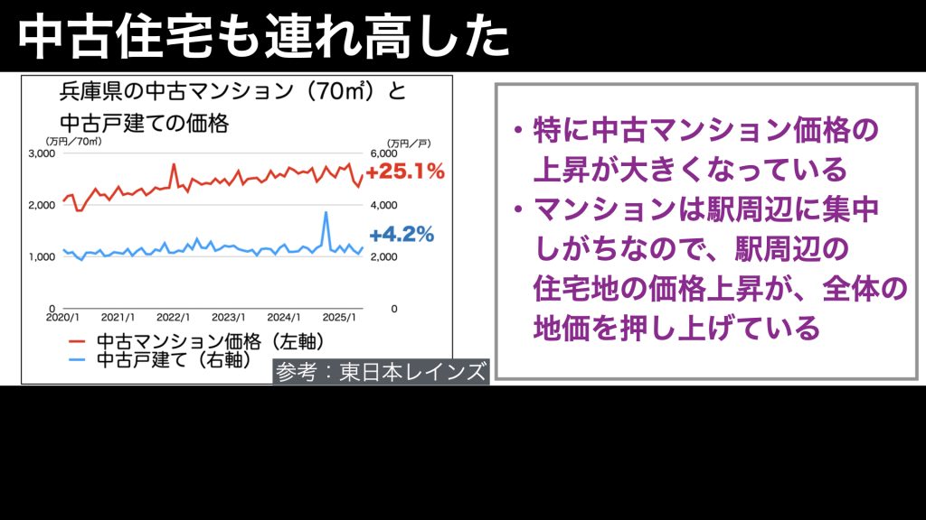 兵庫県の中古住宅を見てみると、2020年から25年までの5年間で、中古マンションは25%、中古戸建は4%上昇していました。