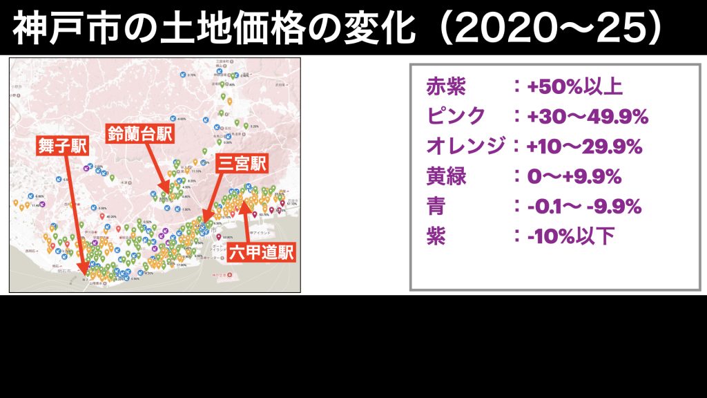 それと、六甲道駅や鈴蘭台駅など、住宅エリアの駅周辺は、そこそこ上昇しているところが多い印象ですね。