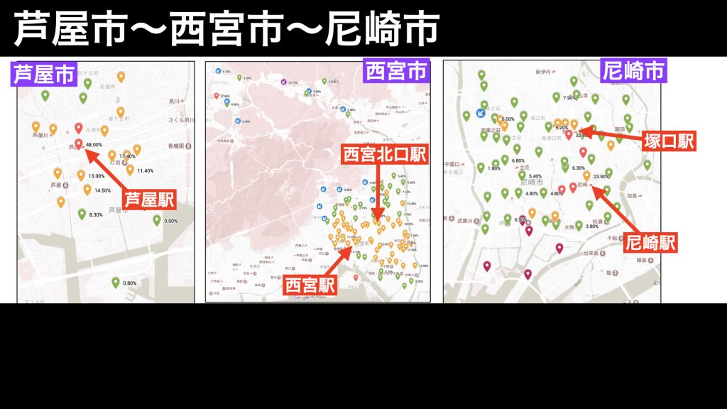 西宮市では、西宮駅、西宮北口駅などの駅周辺は、駅から遠いオレンジ色のエリアよりも、10%ぐらい高くなっています。