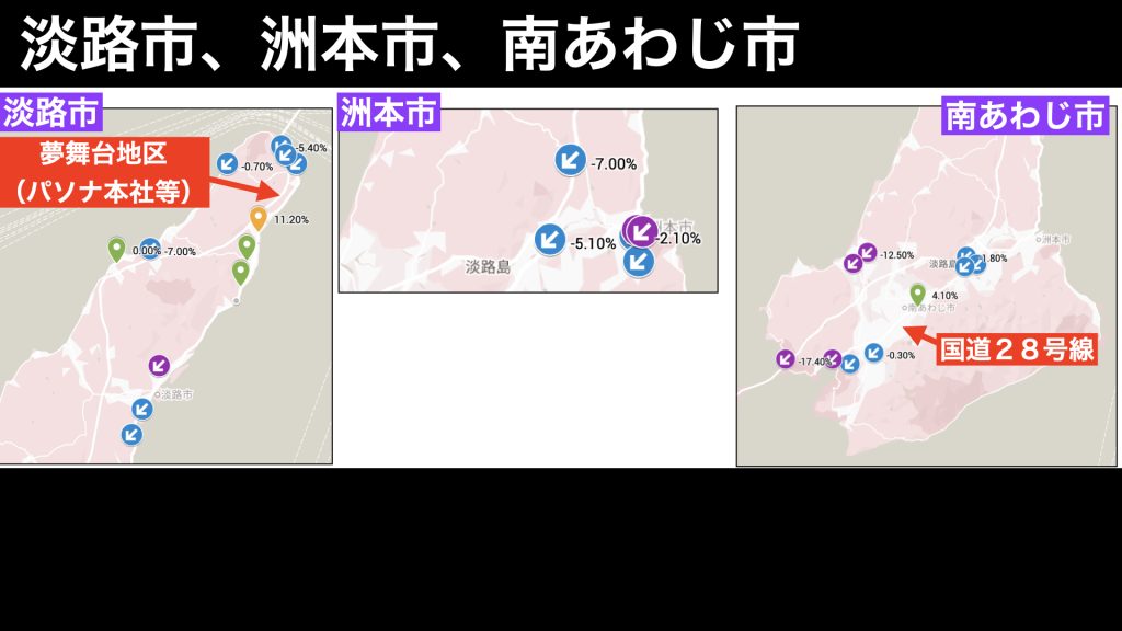 洲本市、南あわじ市は、大体の地域で下落していました。