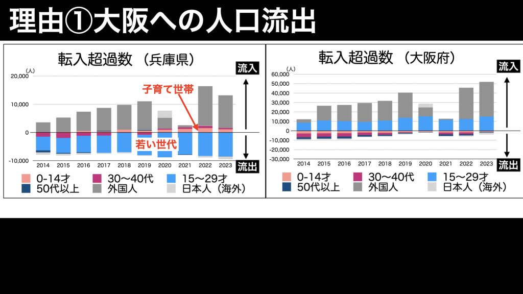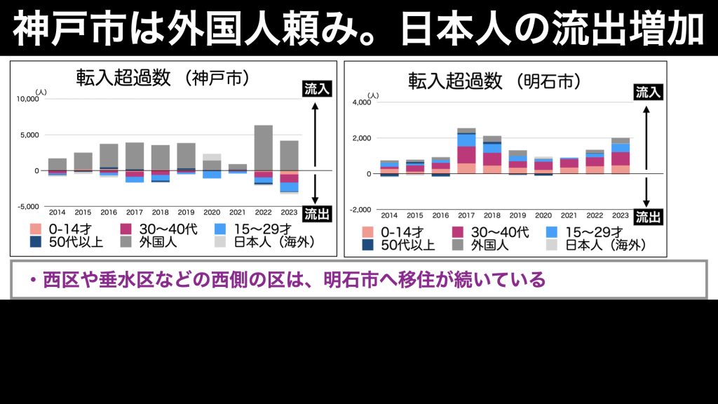 神戸市は、外国人しか増えていませんね。しかも、2022年、23年と、若い世代や子育て世帯で出ていく人の方が増えています。