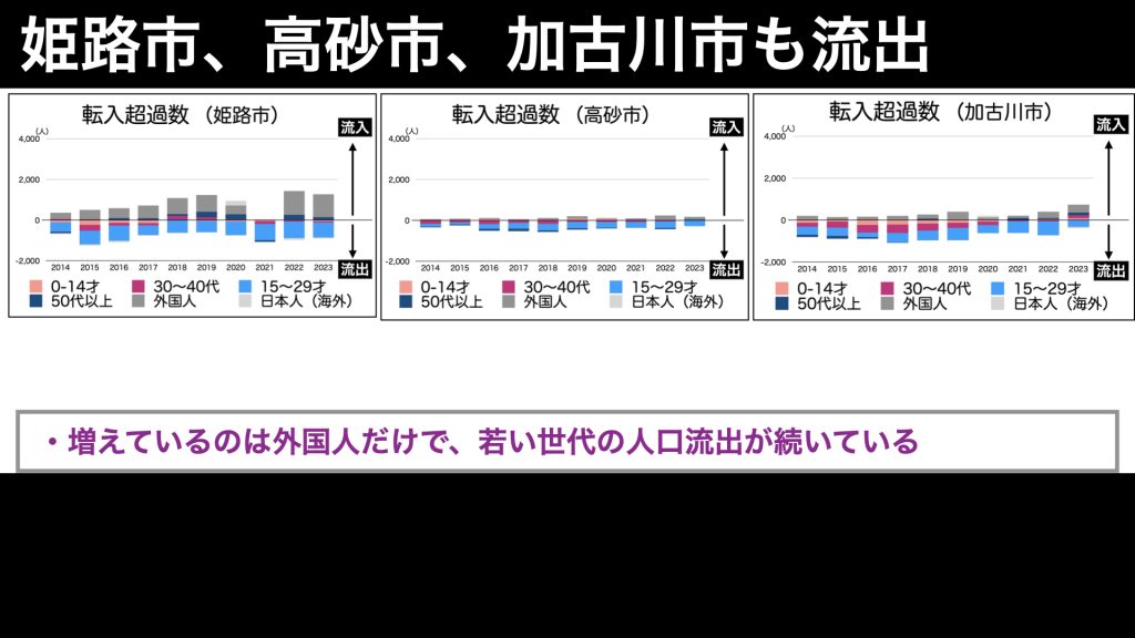 姫路市、高砂市、加古川市は、若い世代の人口流出が続いていますね。姫路市は、外国人の移住が多く、穴埋めをしています。