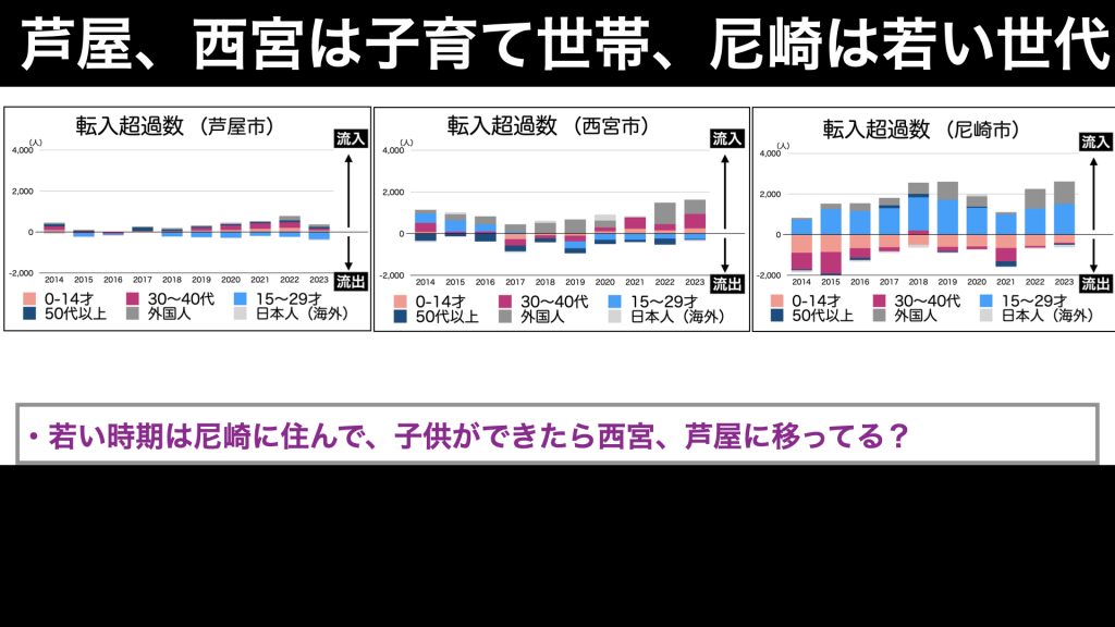 芦屋と西宮は、子育て世帯が若干増えています。逆に尼崎は、子育て世帯は出ていく一方で、若い人は入ってきています。大阪市の隣なので、通勤しやすいからでしょう。