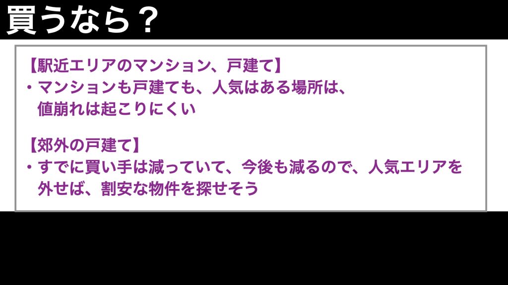 最後に、このような予想を踏まえると、住宅購入または売却を考えている人は、どうしたらいいのか?について、考えてみます。