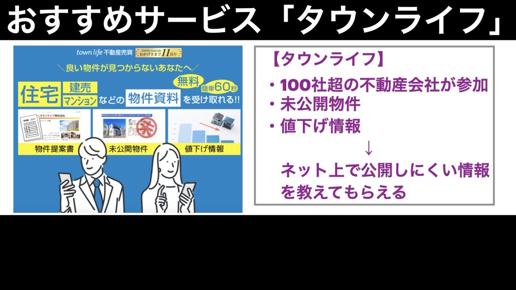 なお、こちらのタウンライフに登録すると、隣近所に知られずに売りたい人の物件や、建売住宅の値下げ情報など、お得な物件情報を教えてもらえます。