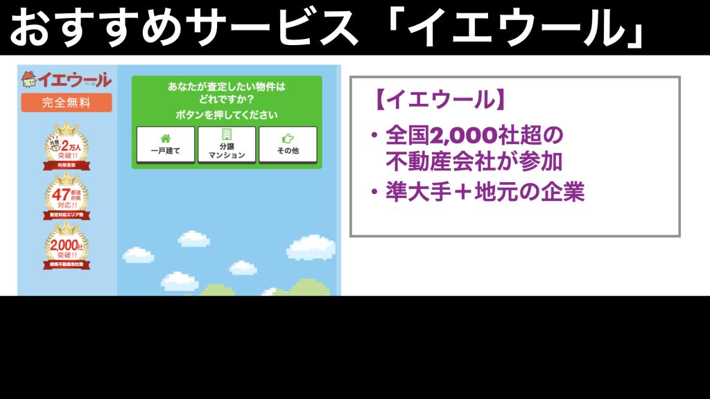 なお、こちらの一括査定サービスのイエウールを使えば、複数の不動産会社から、あなたの不動産がいくらで売れるか?を教えてもらえます。