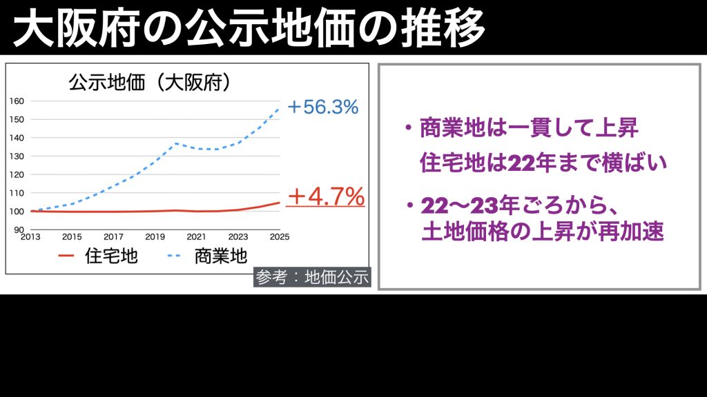 この記事では、「大阪府の土地価格の、①この5年間の動きと、②今後の見通し」について、解説します。
