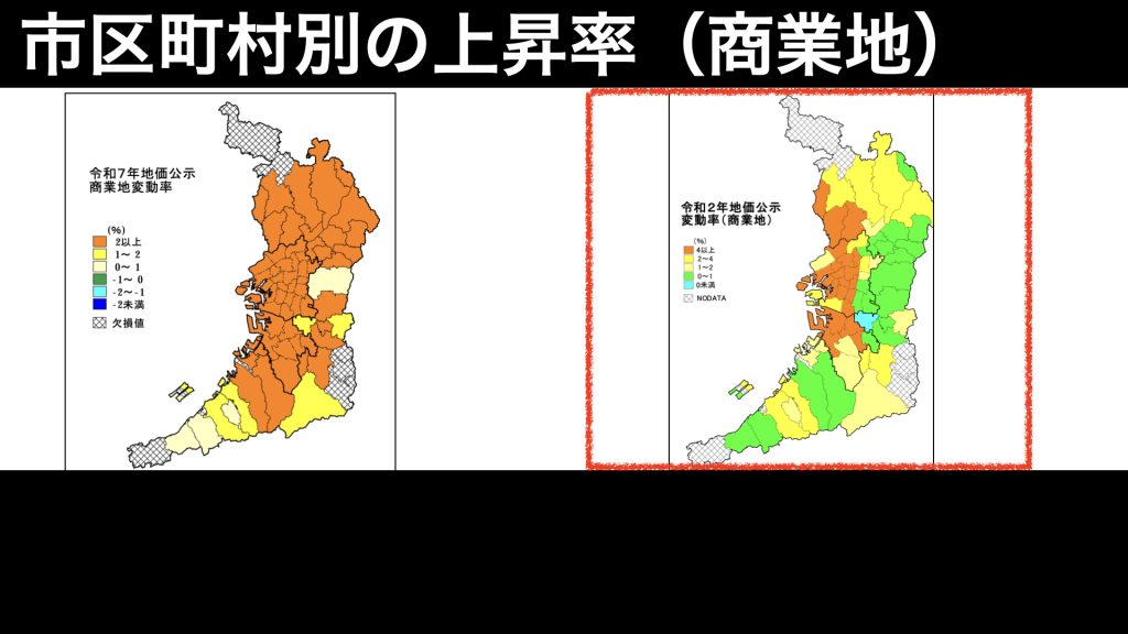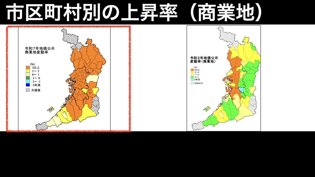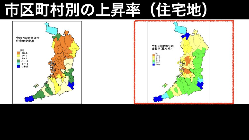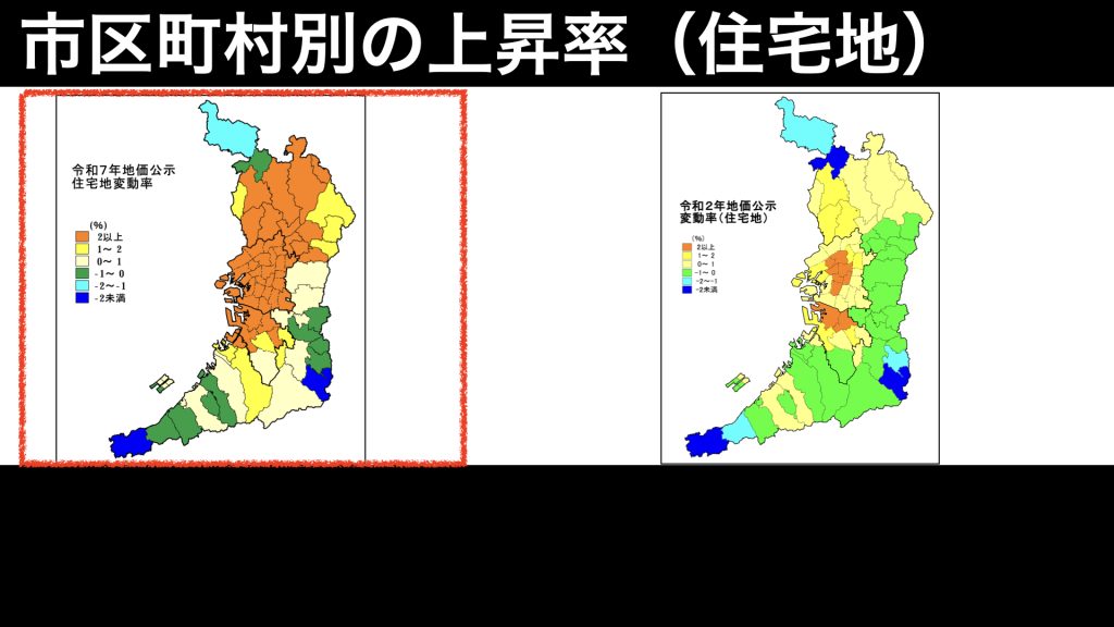 特に戸建ては、駅周辺などの一部のエリアではなく、かなり広範囲にありますから、それらの戸建ての評価額が上がったことで、広範囲の市町村で、土地価格の上昇が見られる、というわけです。