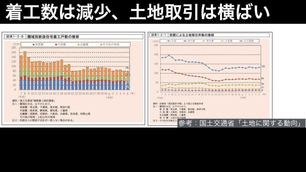 ですが、新しく建てられた住宅の戸数も、土地の取引を伴う不動産登記件数も、この5年間で見ると、横ばいかむしろ減少傾向にあります。