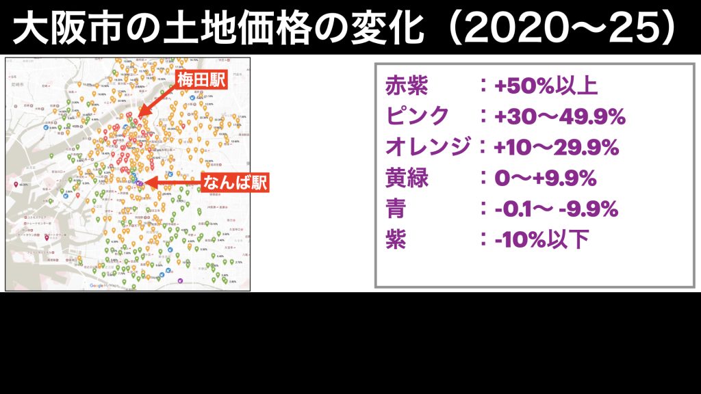 梅田からなんばにかけての、中心部での上昇率の高さが目立ちますね。