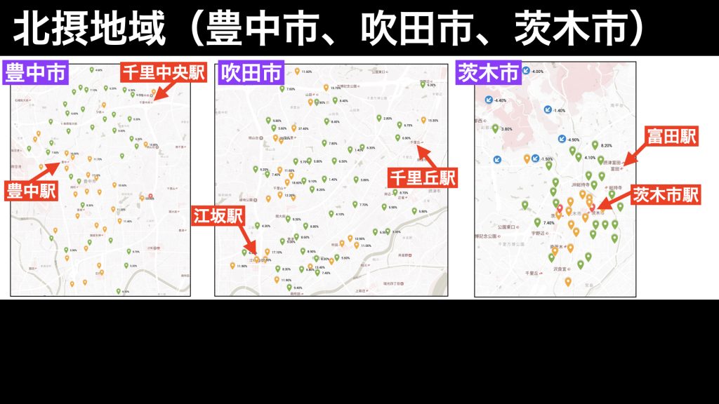 吹田市も、江坂駅や吹田駅、千里山駅、南千里駅などの駅周辺ほど、上昇率が高い傾向にあります。