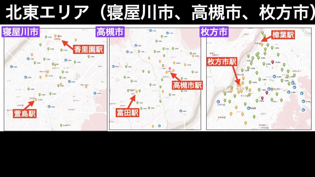 寝屋川市も、寝屋川駅、香里園駅、萱島駅などの駅周辺に、オレンジ色の地区が集中しており、それ以外は緑色のエリアが広がっています。