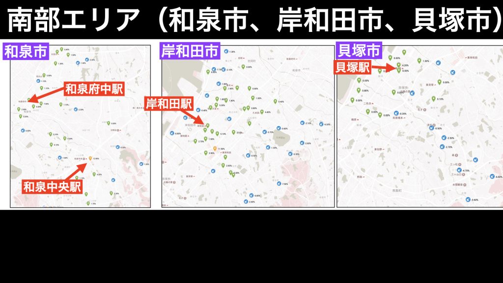 貝塚市は、貝塚駅の周辺で上昇してはいますが、それ以外のエリアは、ほぼ横ばいか、下落しているところが多いですね。