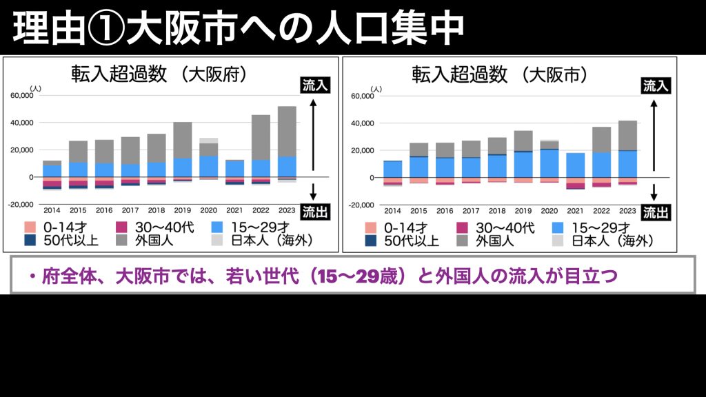 大阪府全体で見ると、関西の中心部ということもあって、若い人の人口流入が継続的にありますが、最近は外国人がさらに増えているようです。