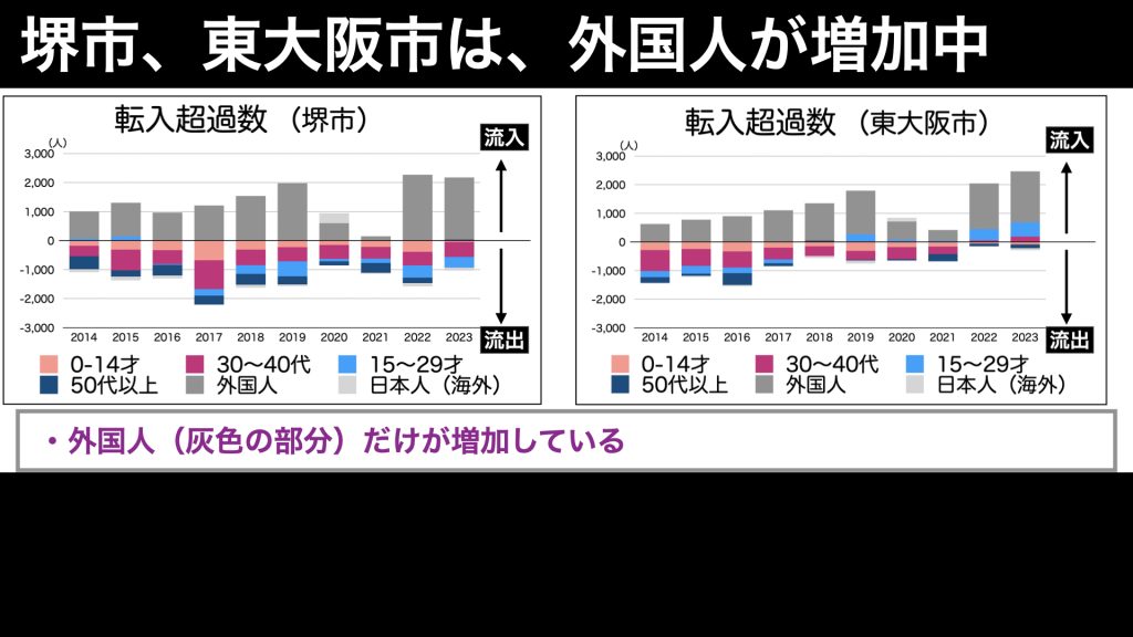一方で、お隣の堺市と東大阪市では、増えているのは外国人だけで、日本のほとんどの世代において、マイナスとなっています。