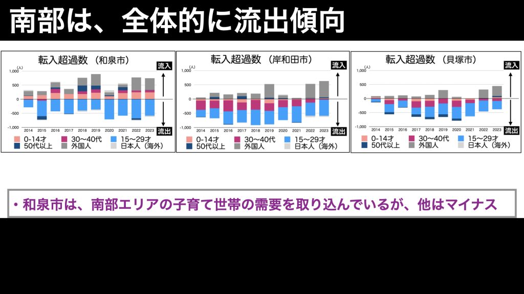 最後に、南部エリアですが、全体的に市外へ人が流れていっている感じですね。和泉市は、和泉中央駅の周辺で開発が進んでいるので、子育て世帯を惹きつけているのかもしれません。