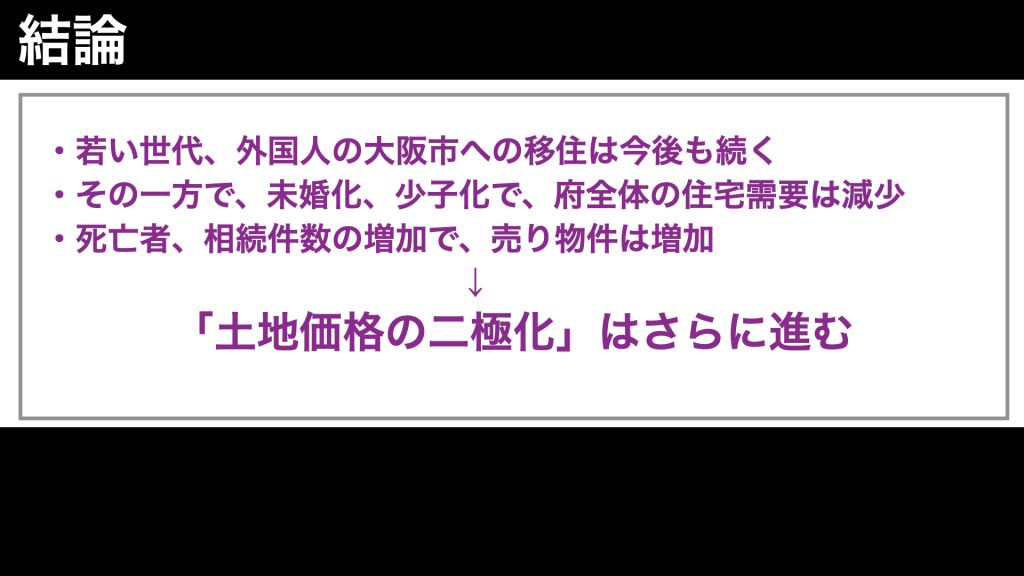 基本的には、ここまで各都市について、ご紹介してきたように、大阪市とその近郊では、さらに上昇または安定するでしょうが、そうでない地域は下落しやすいという、二極化が進むと思われます。