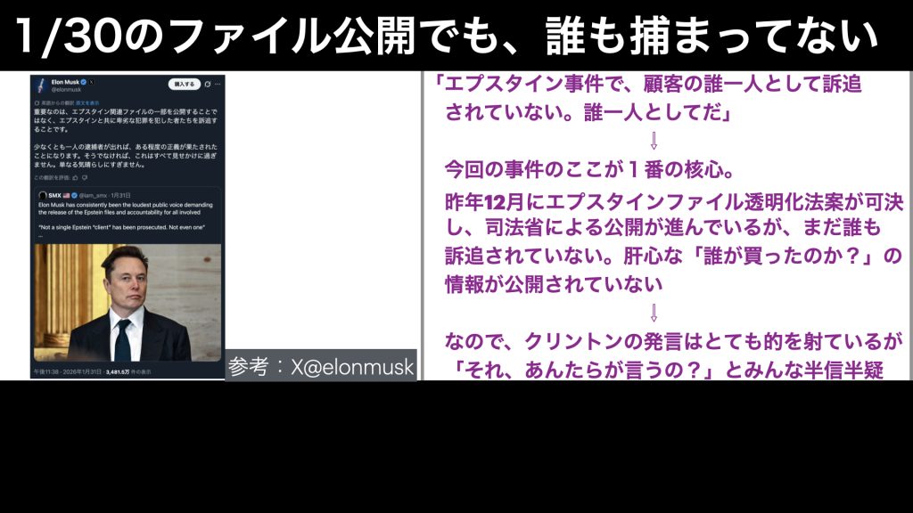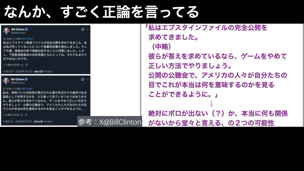 私はこれまで、トランプ政権のエプスタインファイルの公開への、ふざけた対応と、その裏の意図について、何本か動画にしてきましたが、ここに来てまさかの、クリントン夫妻もトランプ氏とグルの可能性が出てきたのです。