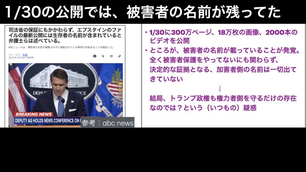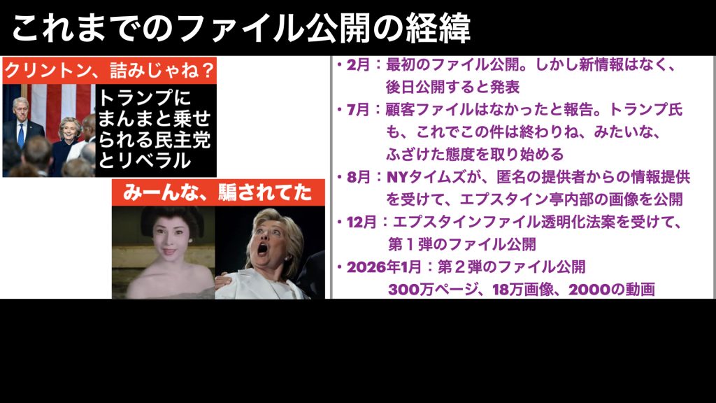エプスタイン財団という、エプスタインの弟が運営している財団からの文書を民主党が公開したり、超党派の議員団で、エプスタインファイル透明化法案という法律を可決させ、昨年12月19日と、今年1月30日に、司法省によるファイル公開が行われたというのが、ここまでの流れです。