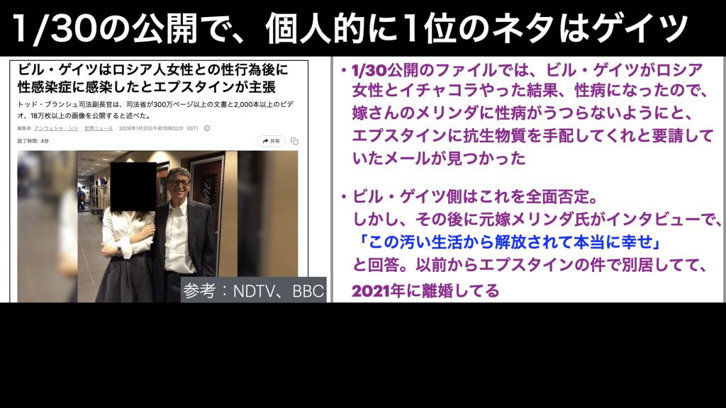 メリンダさんは、以前からエプスタインの件で別居してて、2021年に離婚してるのですが、ビル・ゲイツ氏が、エプスタインと関わって、盛っていたというのは、今回のメリンダさんの反応から見ても、まあ間違いないかなと思いましたね。