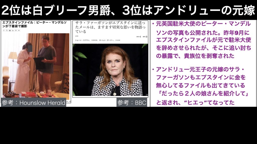 とまあ、こんな感じで、1月30日のエプスタインファイルの公開内容で話題になっているのを見ると、米国内でやらかした人たちよりも、イギリスやノルウェー、スロバキアなどの欧州諸国の政治家についての暴露がの方が多いような印象です。