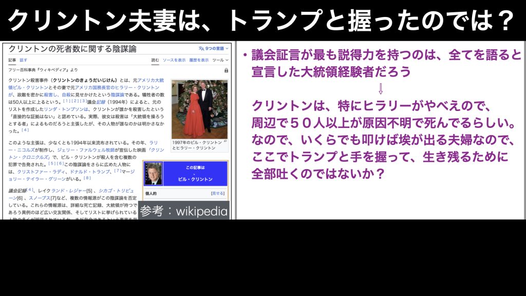 そこで今回の動画では、もしクリントンが白だったとしたら、どんな展開があり得るのか?そして、なぜトランプ政権は、このようなめんどくさいことをやってきたのか?について考察していきます。