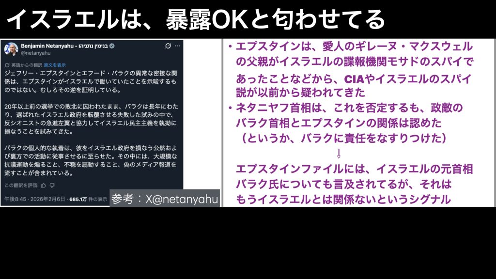 内容は、要するに、政敵のバラクという元首相がいるのですが、こいつがエプスタインに近づいて、イスラエルで政権を取り戻そうとしていたのであって、現在のイスラエル政府とは関係ない、というものでした。