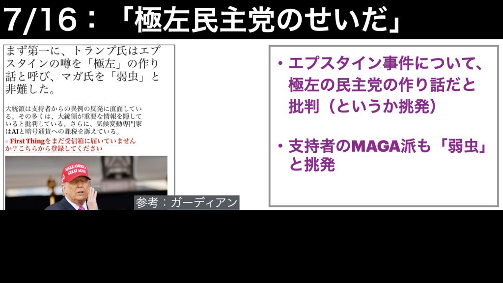 さらに、16日には、エプスタイン事件のいろいろな疑惑については、極左の民主党の仕業だと責任転嫁し、支持者のMAGA派の人たちに対しても、まだグズグズ言ってる弱虫がと、逆に挑発するぐらいのことをしていました。
